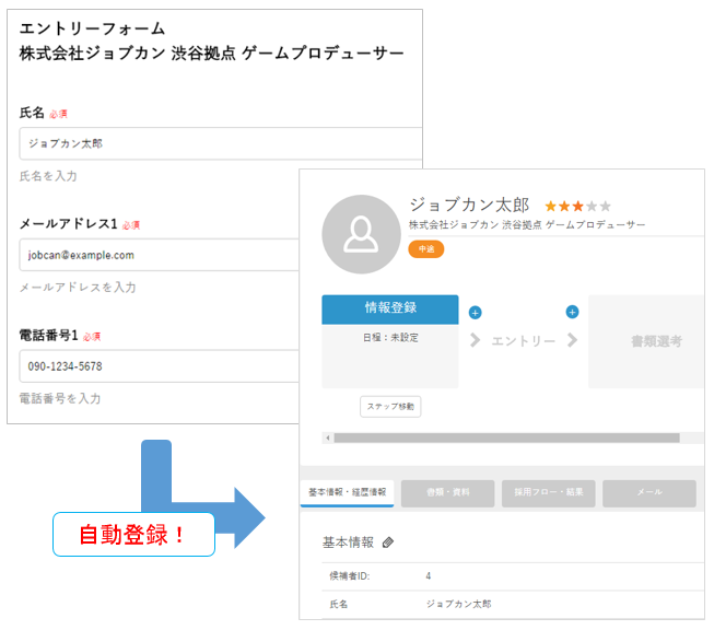 作成したエントリーフォームから登録された情報は、候補者情報として自動登録されます。