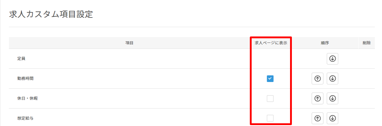 3. 求人カスタム項目設定画面から求人ページに表示したい求人カスタム項目のチェックボックスにチェックを入力します。