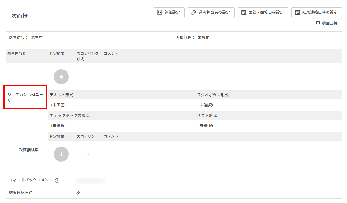 ジョブカン採用管理では、選考担当者や採用担当者が選考の結果を入力することができます。