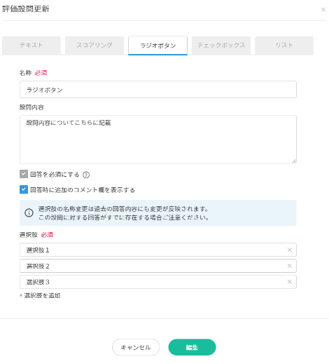 編集したい項目名をクリックし、「評価設問更新」のモーダルより編集が可能でございます。