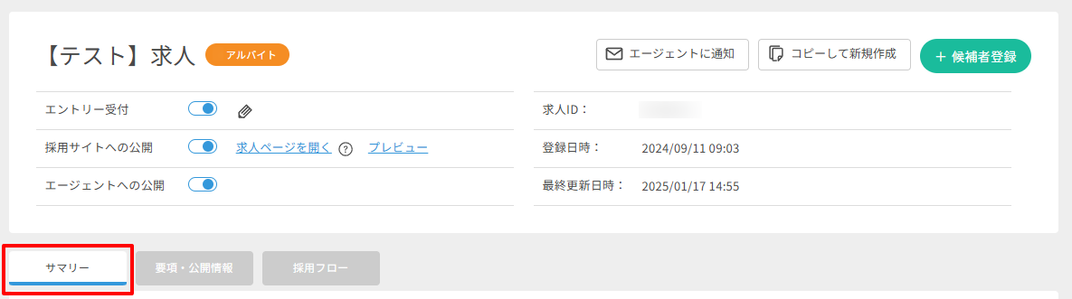1. 該当の求人詳細画面より「サマリー」タブをクリックします。