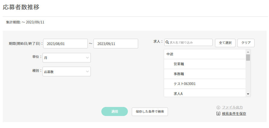 応募者数推移のレポートでは、月・週・日ごとの各求人の応募者数をグラフ化してレポート表示することができます。また、応募数だけでなく、内定数や書類選考通過数なども表示させることが可能です。
