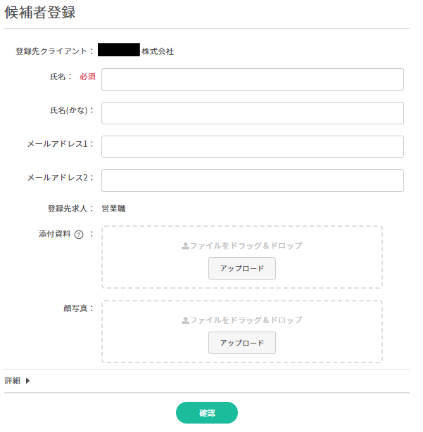 | 登録先求人 | 求人の詳細画面より候補者を登録すると開いている求人が設定されます。 | - | |