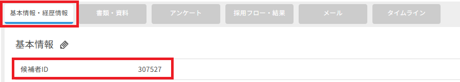 3. 候補者詳細画面の「基本情報・経歴情報」タブをクリックし、候補者IDを確認します。