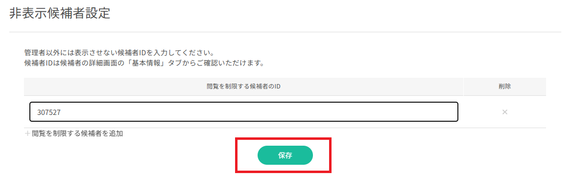 保存することで、採用担当者権限・選考担当者権限のユーザーの画面には該当の候補者が表示されなくなります。