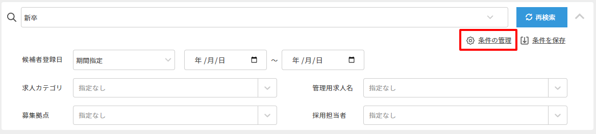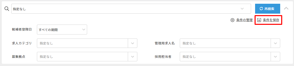 | 候補者登録日 | 「日数指定」又は「期間指定」をプルダウンで選択が可能です。 ・「日数指定」:候補者が登録されてからの日数の指定 ・「期間指定」:候補者が登録された期間の指定 (開始日・終了日の片方のみの指定も可能です) |