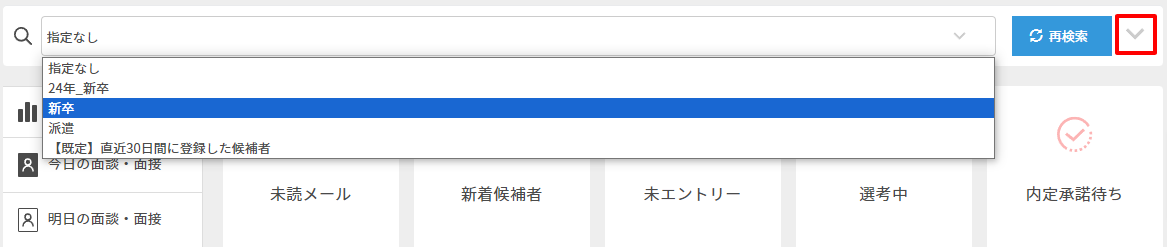 | 新着候補者 | 新着候補者数を表示します。 新着候補者は登録されてから一度も詳細画面を開いてない方が対象になります。 ※ご利用されているユーザー様どなたか1名でも候補者詳細画面を開くと、 カウント対象から外れるため、表示されなくなります。 新着候補者の除外方法はこちら。 |