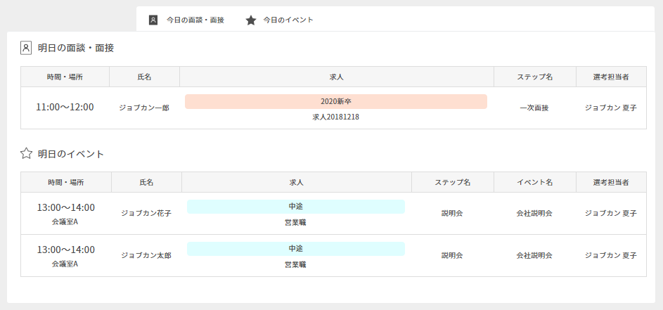 | 時間・場所 | 面接時刻と面接場所(会議室)を表示します。候補者の並び順は面接予定時刻順になります。 |