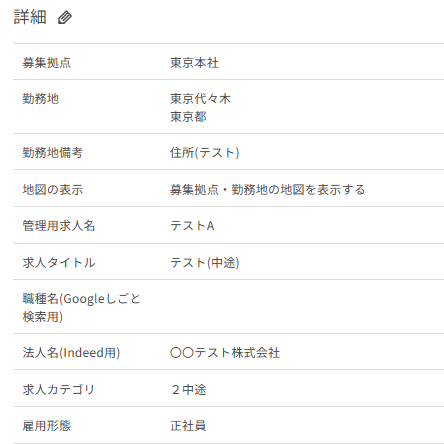 求人名(googleしごと検索用)に職種名が入力されている場合は、こちらがGoogleしごと検索に反映されます。