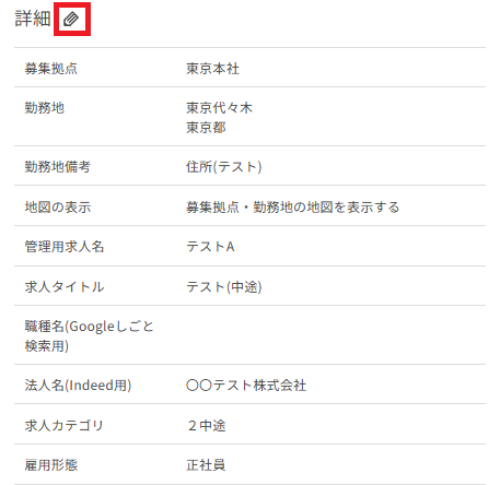 既に作成されている求人情報の「募集要項」などの項目を編集する方法は以下の通りです。