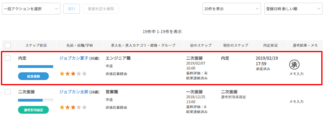 2. 候補者一覧よりジョブカン労務HRに送る候補者を選択します。