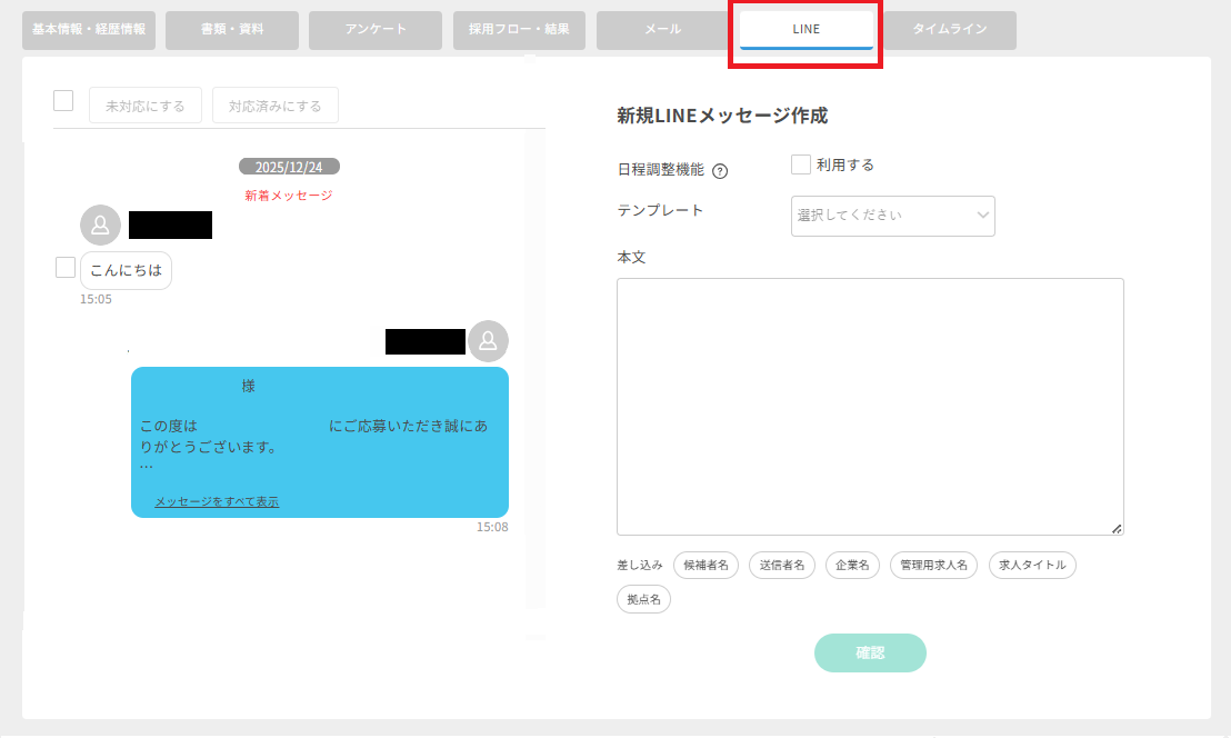 候補者詳細画面の「LINE」タブでは、LINEメッセージの送信や、送受信履歴の確認が可能です。