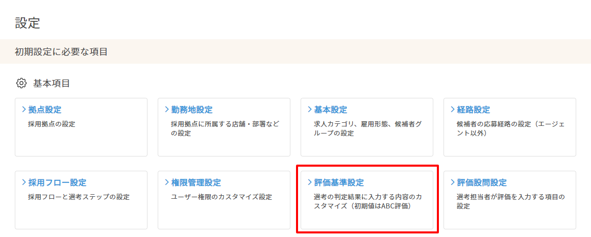 2. 「基本項目」内の「評価設定」をクリックします。