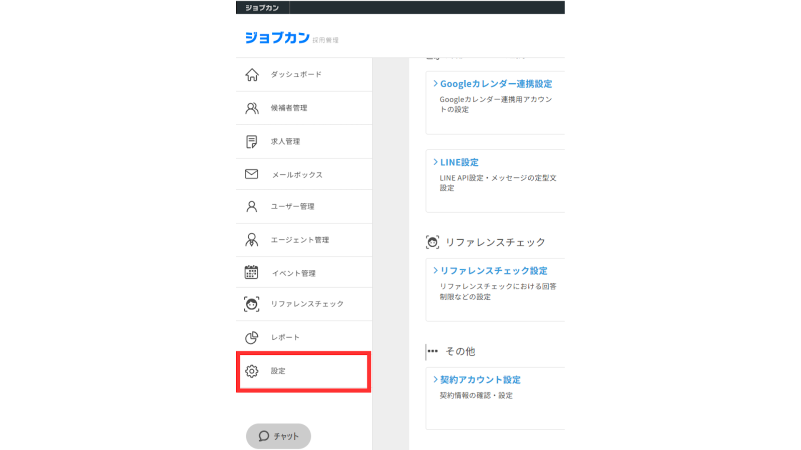 1,左側のメニュー内の「設定」をクリックします。