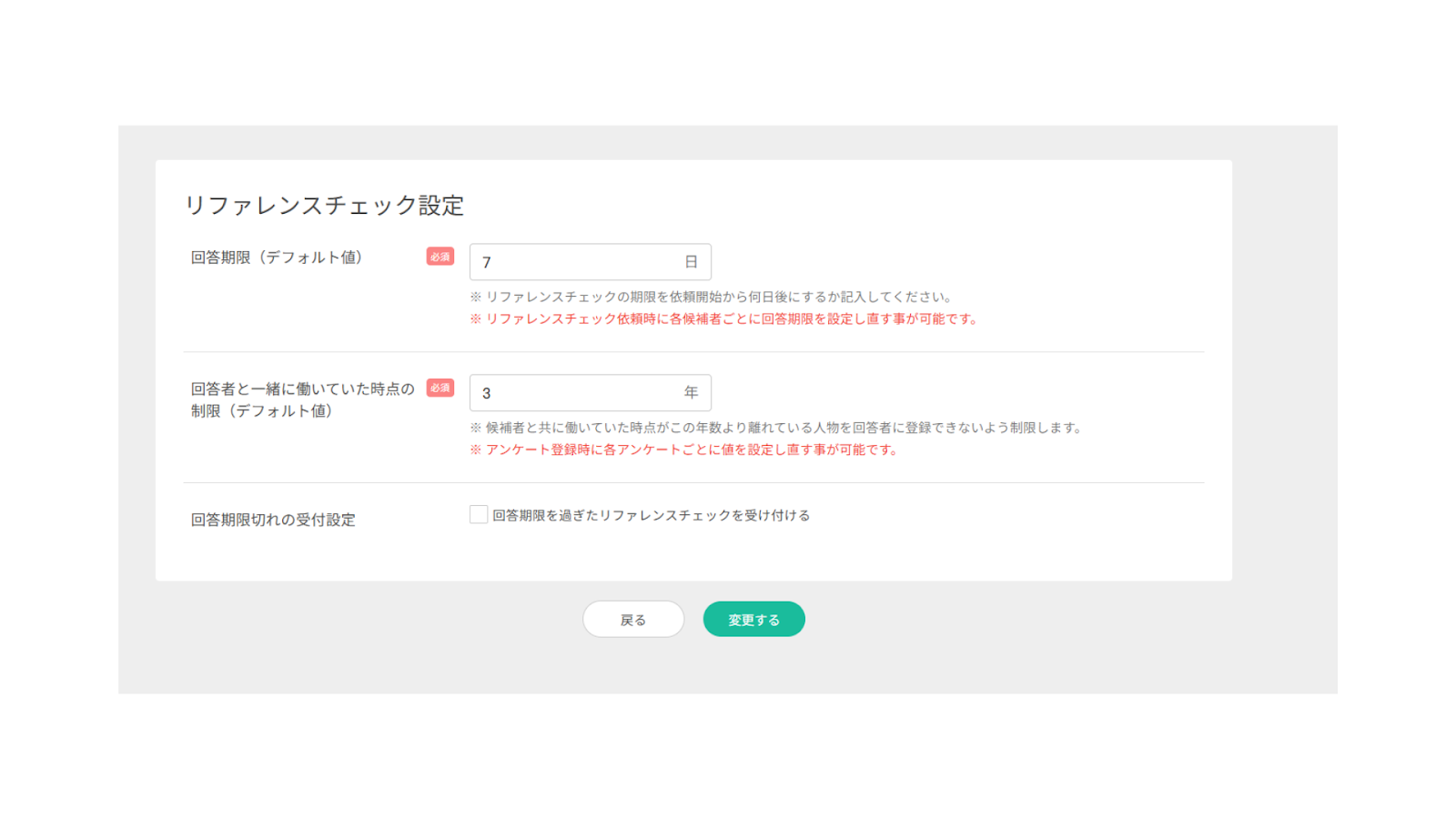 回答期限後の回答も受け付けるかどうか ※本設定につきましては、リファレンスチェックの依頼時に、 |