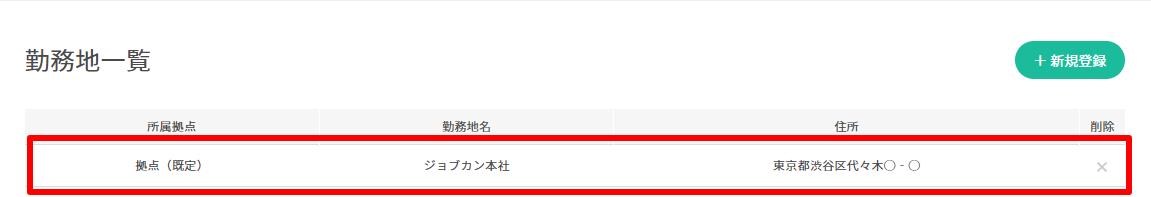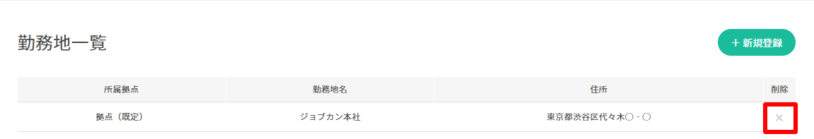 3. 勤務地の一覧画面から削除したい拠点の右側のをクリックします。