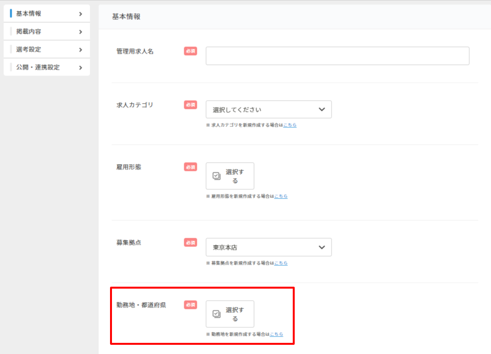 勤務地設定以降に、勤務地の拠点と同じ拠点に紐づいた求人を、左側メニュー内の「求人管理」内から新規作成したり編集すると、項目「勤務地・都道府県」の最初に「勤務地設定」で設定した「勤務地名」が表示されます。