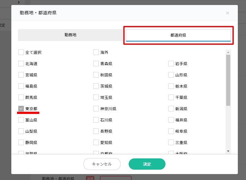 ジョブカン採用管理では、求人を作成するときに、その求人の勤務地(実際に働く場所)を都道府県単位(または「海外」)で指定します。